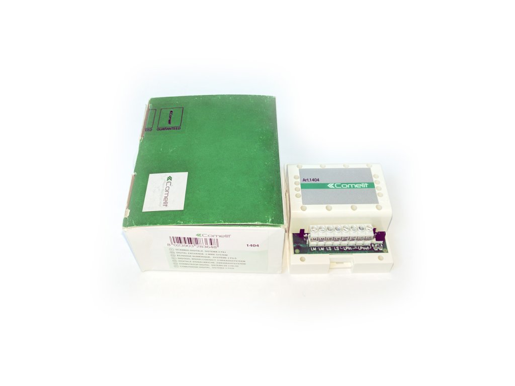 Prepínacia jednotka 1404 pre zapojenie 2 dverných jednotiek Simplebus 2W, napájanie zo zbernice, rozmery 35 x 90 x 58 mm, inštalácia na DIN lištu (2 pozície).