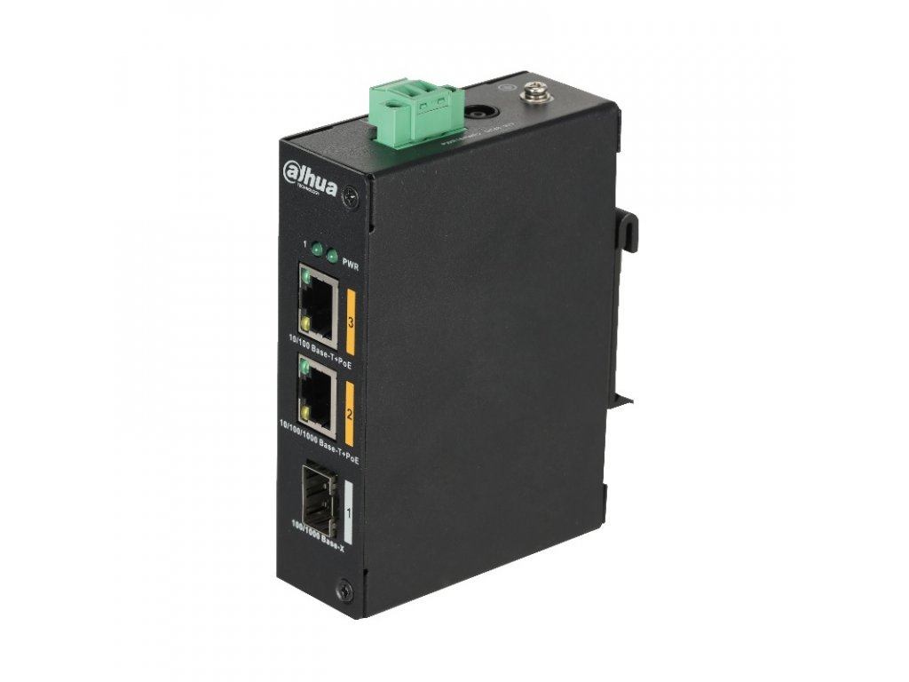 2portový switch Dahua, 1x 10/100 Mbps PoE port, 1x 10/100/1000 Mbps PoE port, 1x 100/1000 Mbps SFP, DC 48–57 V, podpora Hi-PoE 60 W, IEEE802.3af, IEEE802.3at, maximálny odber celkom 60 W, bez manažmentu, prevádzková teplota od -30 °C do +60 °C, zdroj je súčasťou balenia, rozmery 105 x 75 x 30 mm.