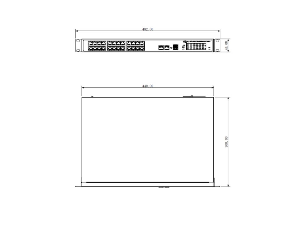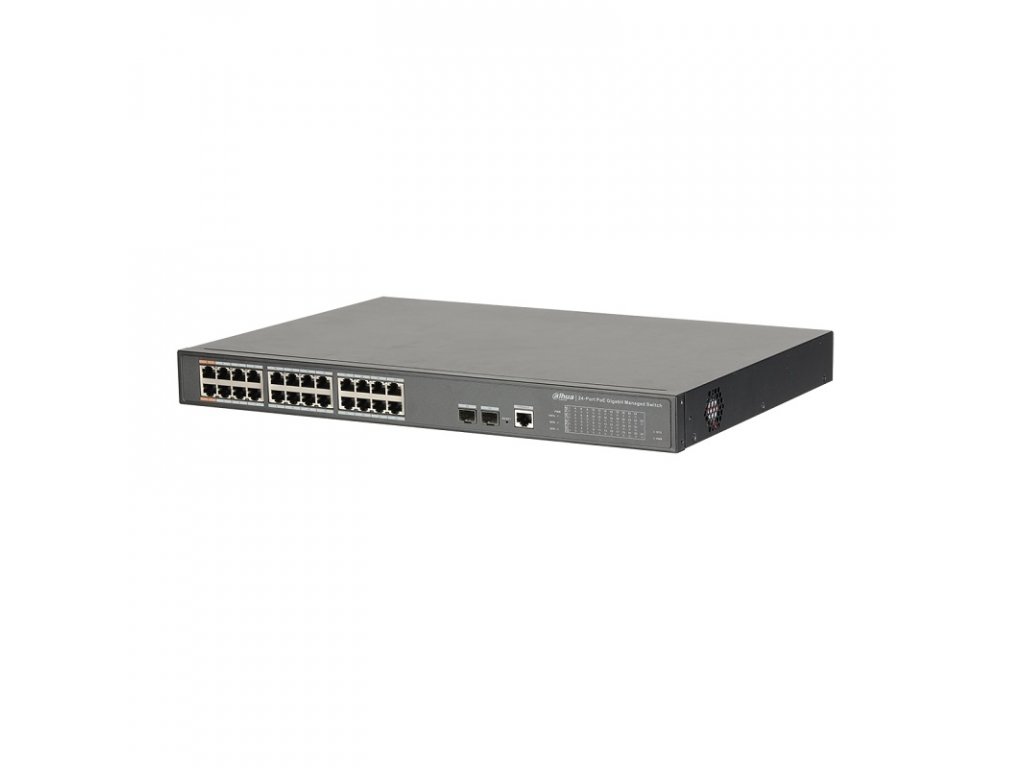 Dahua switch 24x 10/100/1000 Base-T + 2x 100/1000 Base-X, podpora PoE pre 24 portov, prvý a druhý port Hi-PoE, 24x PoE (IEEE802.3af/at), celkovo na všetky porty max. 360 W, napájanie 100–240 V AC, rozmery 440 x 300 x 44 mm.
