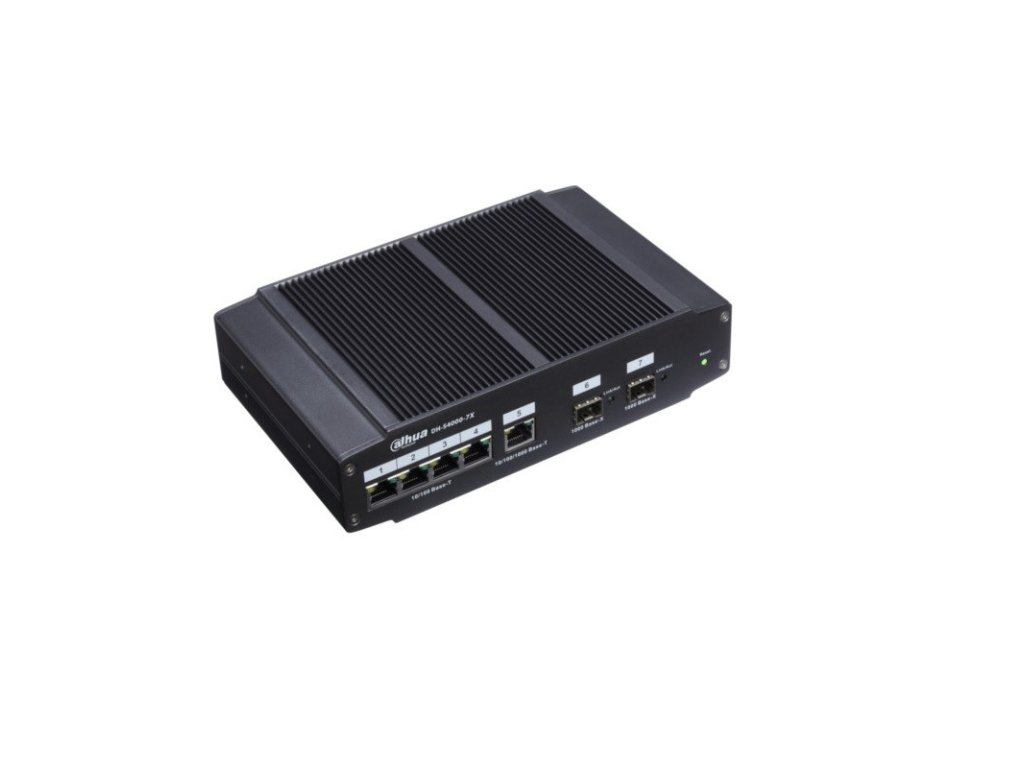 Priemyselný Dahua switch, podpora kruhovej topológie, 2x1 Gbit SFP, 4x 10/100 RJ45, 1x 10/100 Mbsp/1 Gbit RJ45, napájanie 12 V DC, 24 V AC, prevádzková teplota od -40 °C do +75 °C.Switch nie je vhodný pre použitie s kamerami Avigilon.