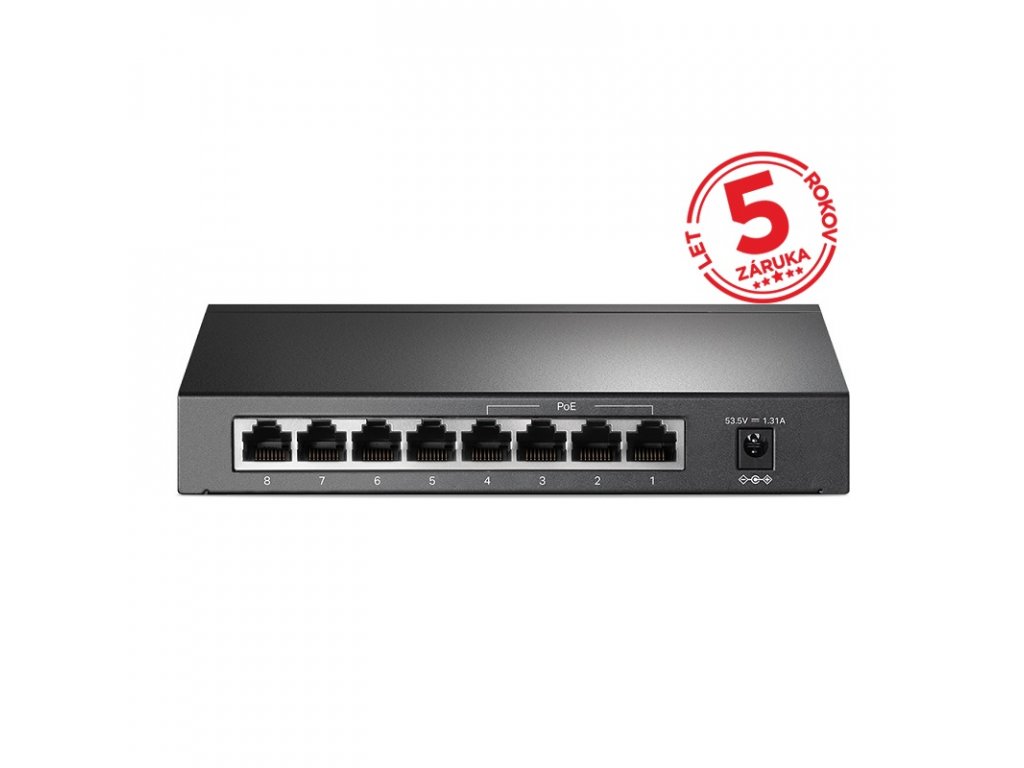 Switch 8 x 10/100 Mbps, porty 1-4 s podporou PoE, max. 55 W.