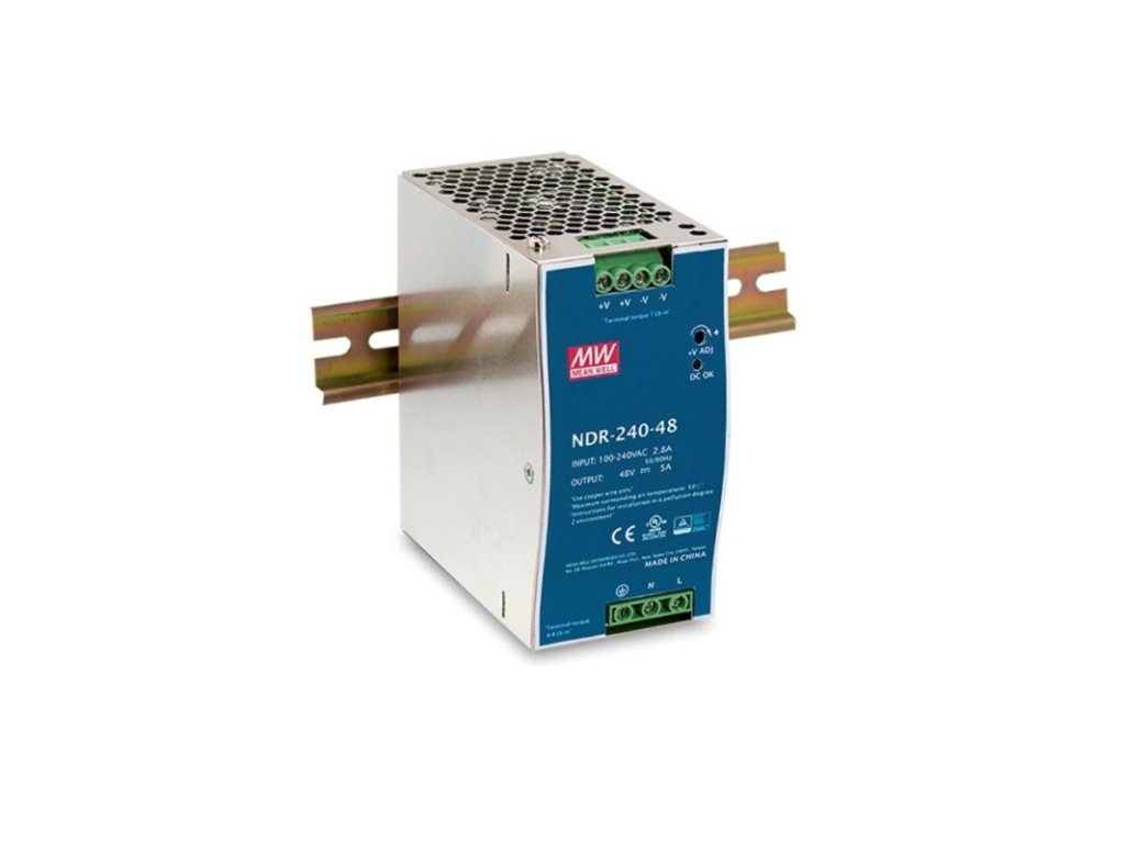 Napájací zdroj 48 V DC / 5 A, vstupné napätie 90 ~ 264 V AC, inštalácia na DIN lištu, ochrana proti skratu, proti preťaženiu, proti prepätiu, teplotná ochrana, prevádzková teplota od -20 °C do +70 °C, rozmery 113,5 x 63,0 x 125,2 mm.